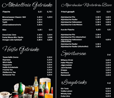 Unten finden Sie unsere Getränkekarte, die eine Auswahl an warmen und kalten Getränken sowie alkoholischen Getränken bietet. Egal, ob Sie ein erfrischendes alkoholfreies Getränk, einen heißen Kaffee oder ein köstliches Glas Bier genießen möchten, wir haben für jeden Geschmack etwas dabei. Stöbern Sie durch unsere Karte und entdecken Sie die perfekte Begleitung zu Ihrem Essen!